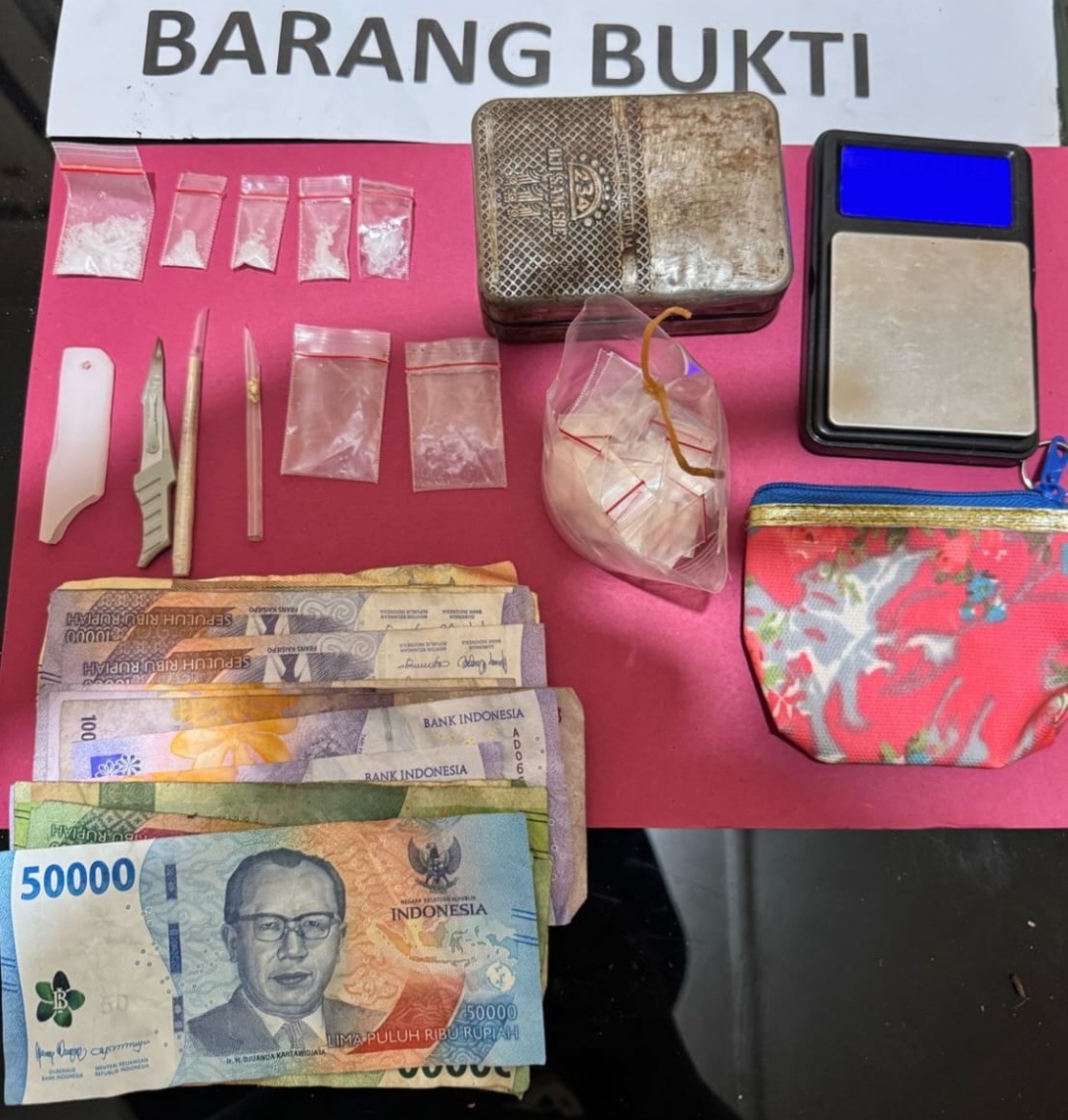 Saat digeledah dari tangan tersangka, personil Unit Reskrim berhasil menemukan 5 (lima) bungkus plastik klip diduga berisikan narkotika jenis sabu, 1 (satu) unit timbangan elektrik, 1 (satu) buah kotak kaleng rokok Merk Dji Sam Soe, 2 (dua) buah pipet kecil berbentuk sekop, 1 (satu) buah pisau karter kecil, 2 (dua) buah plastik klip sedang bekas,1 (satu) buah potongan aqua kecil berisikan 23 (dua puluh tiga) plastik klip kecil, 1 (satu) buah dompet kecil warna merah dan uang tunai senilai Rp.230.000,- (dua ratus tiga puluh ribu rupiah).