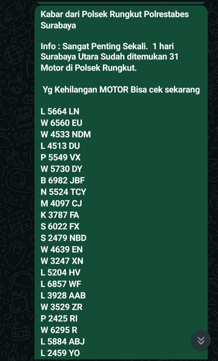 Surabaya (fokusinvestigasi.com) – Beredar kembali di grup WhatsApp masyarakat Surabaya dihebohkan dengan kabar Polisi menemukan puluhan motor hasil curian. Narasinya, Polsek Rungkut dalam sehari menemukan 31 motor. Bagi masyarakat yang merasa kehilangan diminta mendatangi mapolsek.