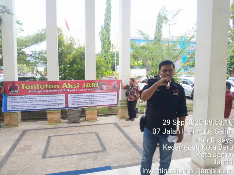 Jambi – Fokusinvestigasi.com, suara lantang massa Jaringan Advokasi Rakyat Indonesia (JARI) menggema di depan Kantor Dinas Lingkungan Hidup (DLH) Provinsi Jambi,Senin (29/9/2025) Mereka menuntut penindakan tegas atas praktik galian C ilegal di Desa Sungai Abang, Kabupaten Sarolangun, yang dinilai merusak lingkungan, menggerus hak hidup rakyat, sekaligus menelanjangi wajah hukum yang tumpul di hadapan kepentingan modal.