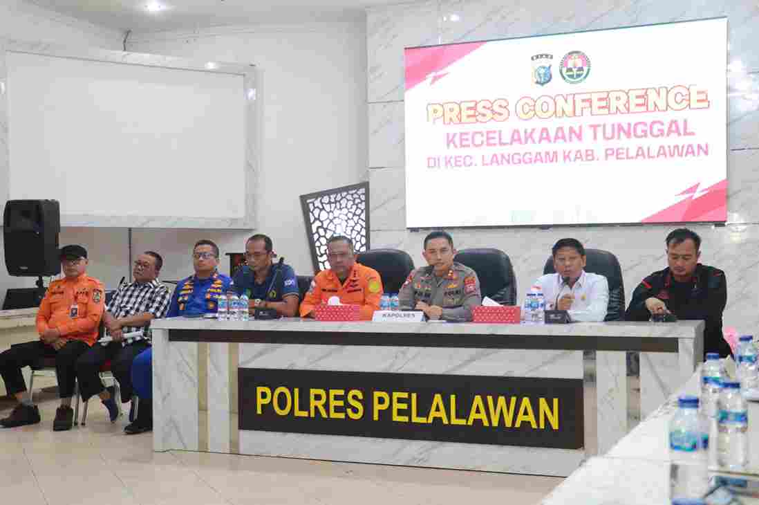 PELALAWAN (FI) – Kapolres Pelalawan, AKBP Afrizal Asri, S.I.K., memimpin konferensi pers terkait kecelakaan tunggal truk Colt Diesel yang menewaskan 15 orang di Desa Segati. Konferensi pers ini digelar pada Senin (24/2/2025) di Aula Teluk Meranti. Peristiwa ini menjadi kecelakaan dengan jumlah korban jiwa terbanyak dalam sejarah Kabupaten Pelalawan.