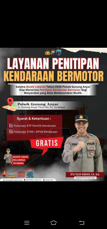 Kapolsek Gunung Anyar Iptu Tulus Wibowo menyampaikan bahwa layanan penitipan motor ini merupakan bentuk pelayanan kepolisian kepada masyarakat guna mendukung kelancaran dan keamanan perayaan Hari Raya Idulfitri.