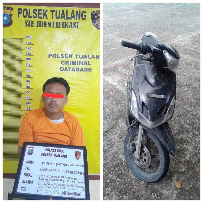 Madan diringkus tanpa perlawanan pada Sabtu (03/01/2026) sore sekitar pukul 17.00 WIB di kawasan Jalan Suka Ramai, tepat di belakang Hotel Highland, Kelurahan Perawang. Selain mengamankan pelaku, polisi juga menyita satu unit sepeda motor Yamaha Mio dengan nomor polisi BM 2075 YK yang diduga digunakan pelaku saat melancarkan aksinya.