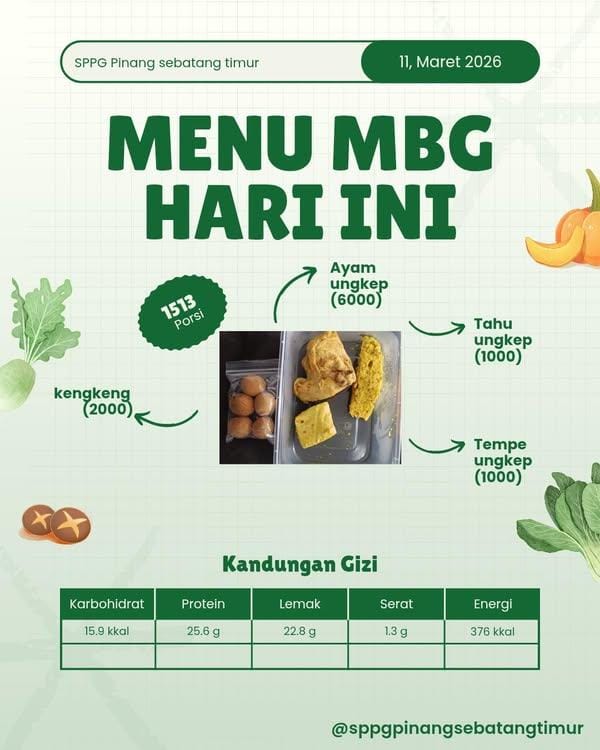 Kepala SPPG Pinang Sebatang Barat, Fadila Afriansyah, menyatakan bahwa seluruh komposisi makanan yang dikirimkan telah dipastikan memenuhi standar Angka Kecukupan Gizi (AKG).